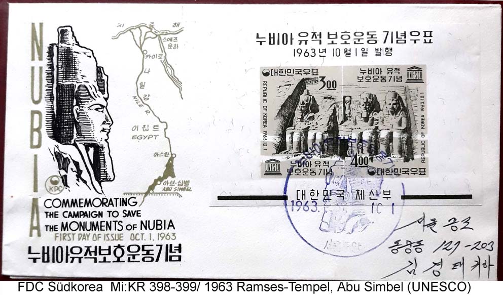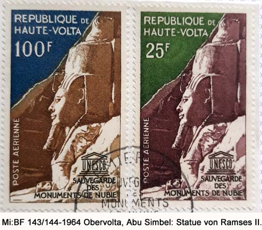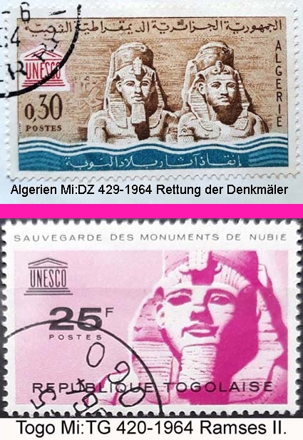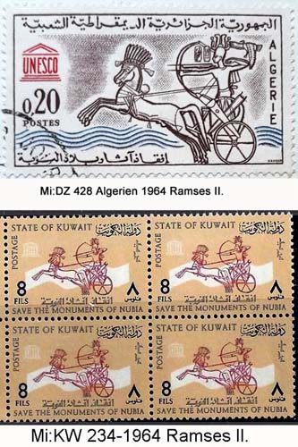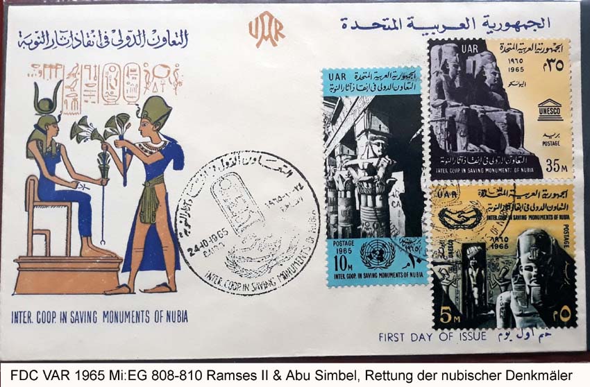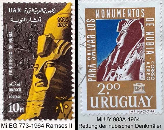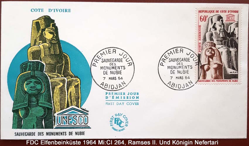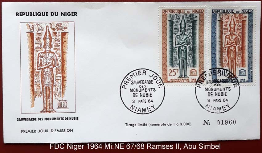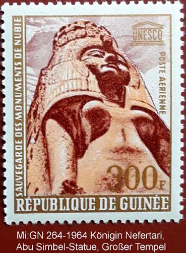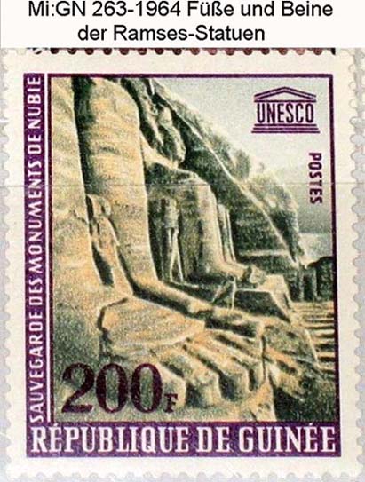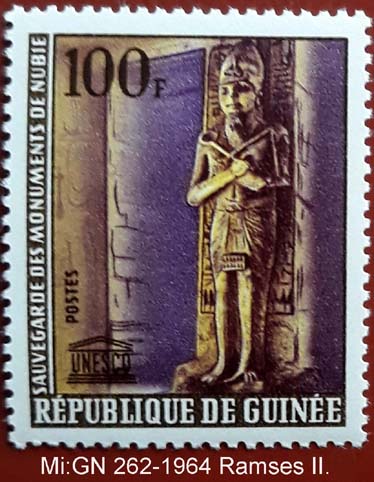 Obiger FDC und die Marke aus Guinea bilden eine der Kolossalstatuen des Pharao ab, die die Pfeiler an der Südseite der großen Halle des Ramsestempels zieren. Die Statuen stellen den König als lebenden Herrscher, mit Krumstab und Geißel über der Brust gekreuzt, sowie der Doppelkrone als Herrschaftsinsignium dar.