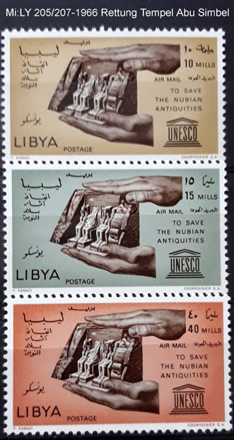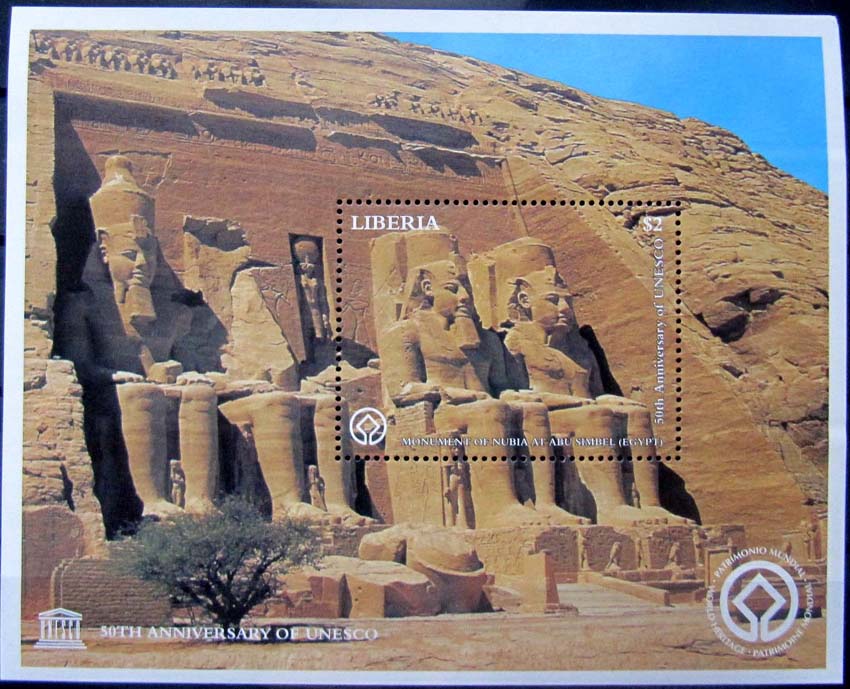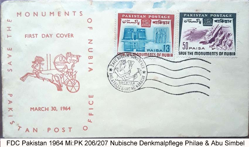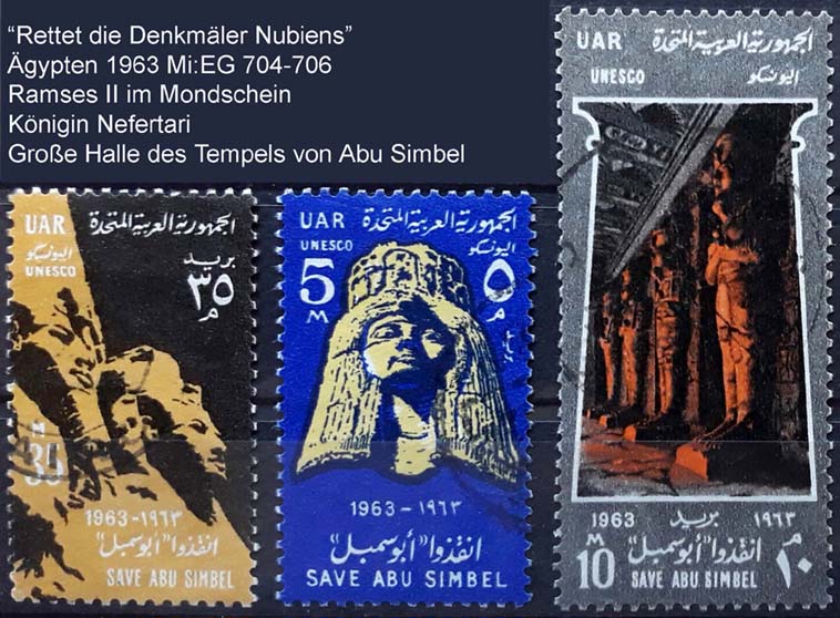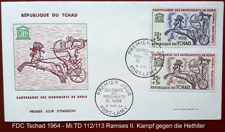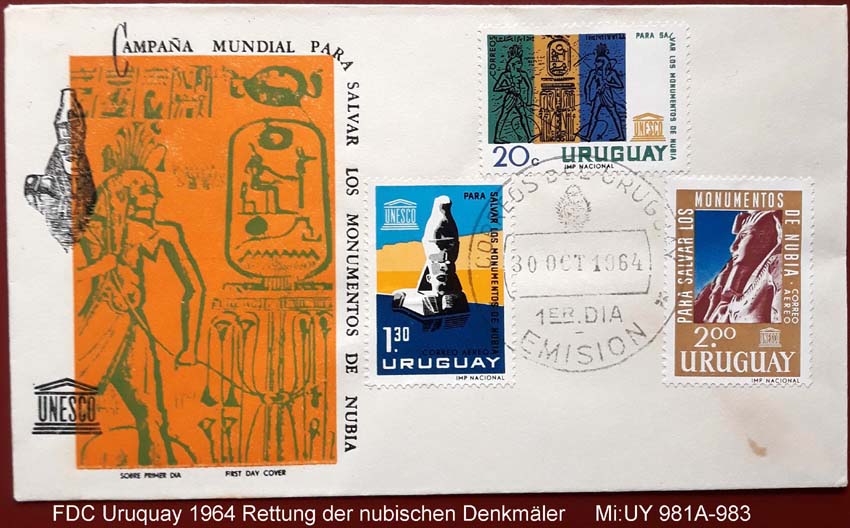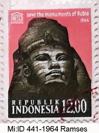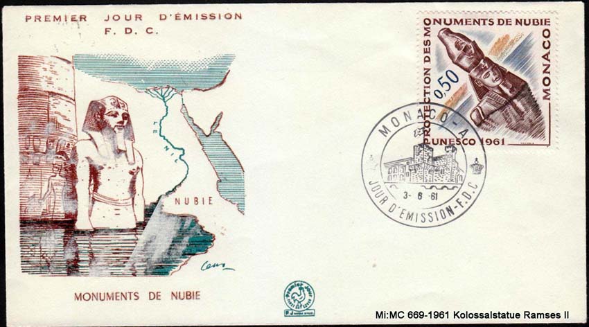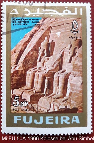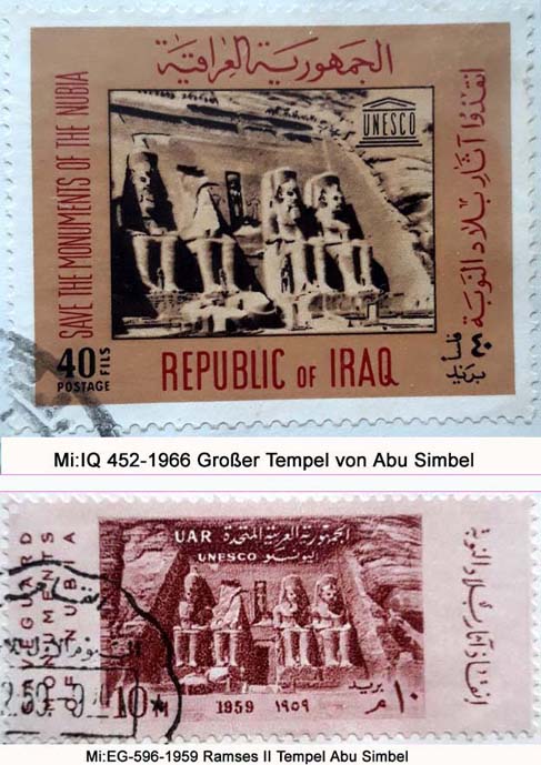 Obiger FDC und die Marke aus Guinea bilden eine der Kolossalstatuen des Pharao ab, die die Pfeiler an der Südseite der großen Halle des Ramsestempels zieren. Die Statuen stellen den König als lebenden Herrscher, mit Krumstab und Geißel über der Brust gekreuzt, sowie der Doppelkrone als Herrschaftsinsignium dar.
