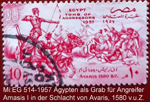 Die ägyptische Briefmarke von 1957 aus der Serie "Ägypten - Grab für Aggressoren" verweist auf die Vertreibung der Hyksos durch den Pharao Ahmose in der siegreichen Schlacht nahe der Stadt Auaris im Nildelta.