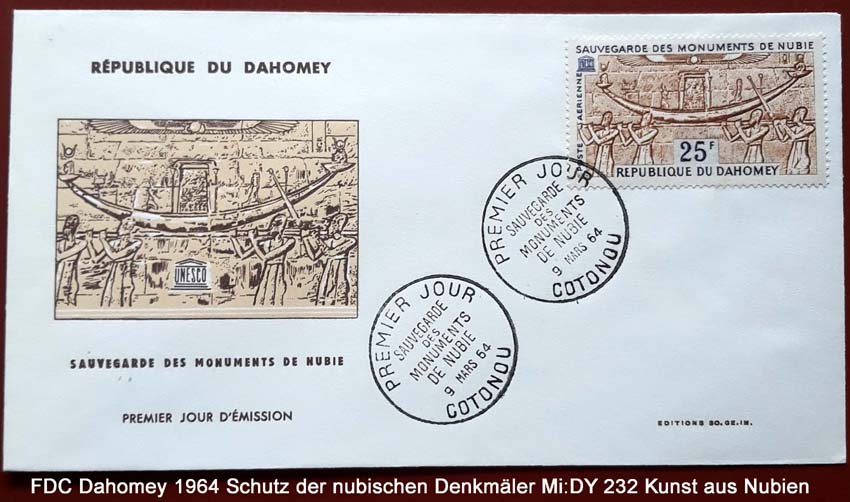 Der FDC aus Dahomey zeigt ein Sonnenbarken-Relief. Priester tragen die heilige Barke des Gottes Amun-Re.