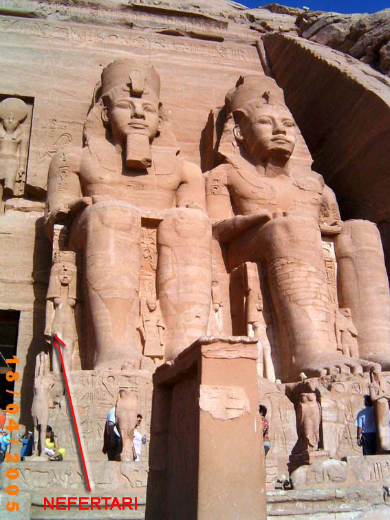 Die kleinere Statue der Nefertari begleitet mit der königlichen Familie die Kolosse Ramses II. am Großen Tempel in Abu Simbel. Die Königin trägt ihren charakteristischen Kopfschmuck mit Geierhaube und Uräusschlange.