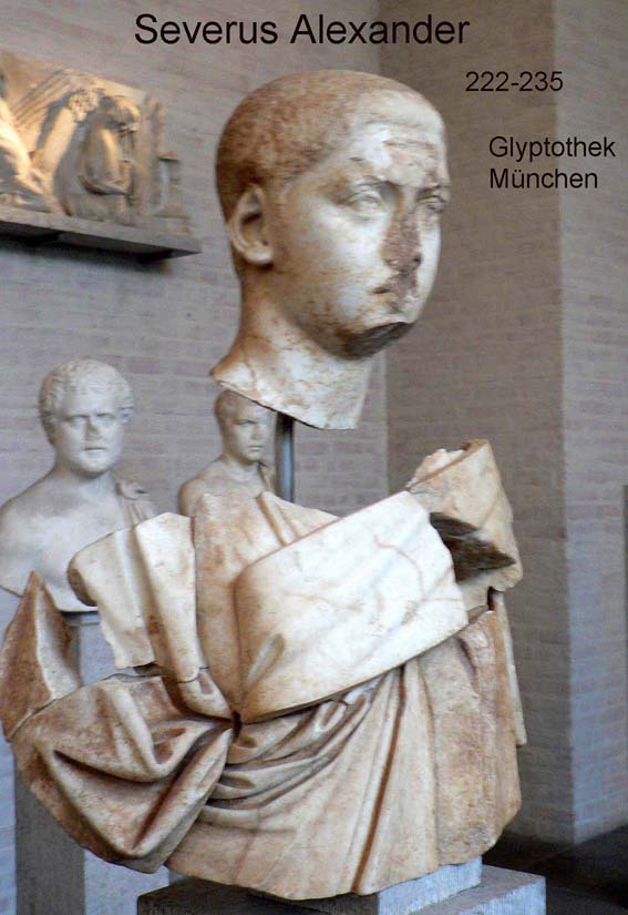 Die severische Dynastie hatte nordafrikanisch-punische Wurzeln seitens des Begründers Septimius Severus und syrische Wurzeln seitens seiner Frau Julia Domna. Die beiden Kinderkaiser kamen bereits mit 14 bzw. 13 Jahren auf den Kaiserthron und wurden mehr oder weniger durch ihre Mütter und Großmutter Julia Maesa beeinflußt und gesteuert. Mit ihnen erlosch diese Dynastie.