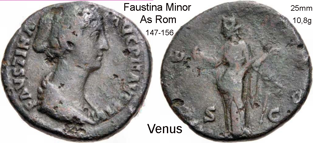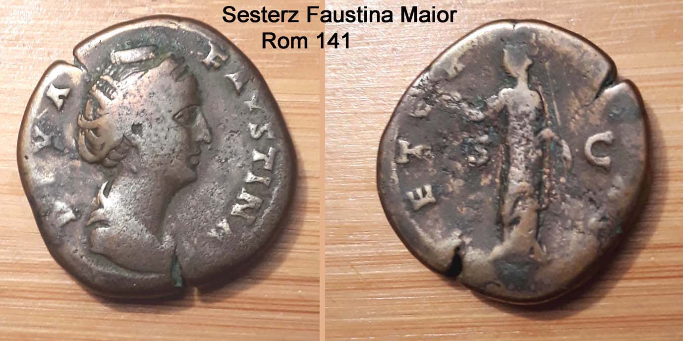 Der Sesterz "Diva Faustina" der Gemahlin des Kaisers Antoninus Pius wurde 141 in Rom geprägt. Schon im 3. Regierungsjahr ihres Mannes starb Faustina im Alter von 36 Jahren. Sie wurde vergöttlicht und ihr zu Ehren ein Tempel erbaut und eine Stiftung für den Unterhalt und die Erziehung von Töchtern aus armen Verhältnissen etabliert. Auf der Rückseite des Sesterzes wird die römische Personifikation der Ewigkeit "Aeternitas" gezeigt. Sie bewirkt die ständige Erneuerung des Römischen Reiches.
