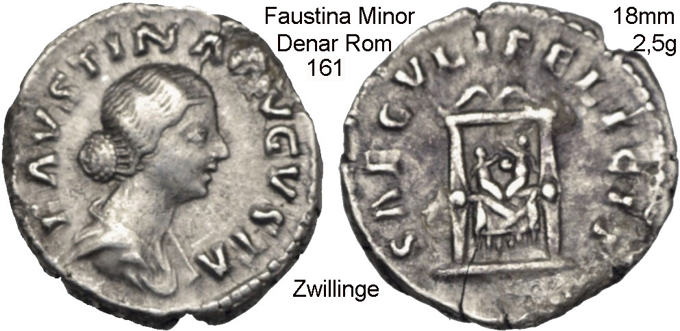 "Wie ein privates Familienfoto wirkt die Abbildung der unbeschwert auf einem Thron spielenden Kinder auf diesem Denar. Die Freude und Erleichterung des Kaiserpaares Marc Aurel und Faustina minor über die Zwillingsgeburt im Jahr 161 ist auch in der Umschrift SAECVLI FELICIT(as) ausgedrückt, welche nichts weniger als das „Glück des Zeitalters“ beschwört. Tatsächlich waren die bisher geborenen männlichen Nachkommen, die den Fortbestand der antoninischen Dynastie sichern sollten, nach kurzer Zeit verstorben, weshalb die hier dargestellten Zwillinge Antoninus und Commodus die Erlösung von der den Kaiser und das Römische Reich bedrückenden Last der ungeklärten Nachfolge bedeuteten. Der kleine Antoninus wurde nur vier Jahre alt, doch sein Bruder Commodus folgte schließlich dem Vater Marc Aurel als römischer Herrscher nach." Sonja Hommen, Landesmuseum Württemberg, Münzkabinett