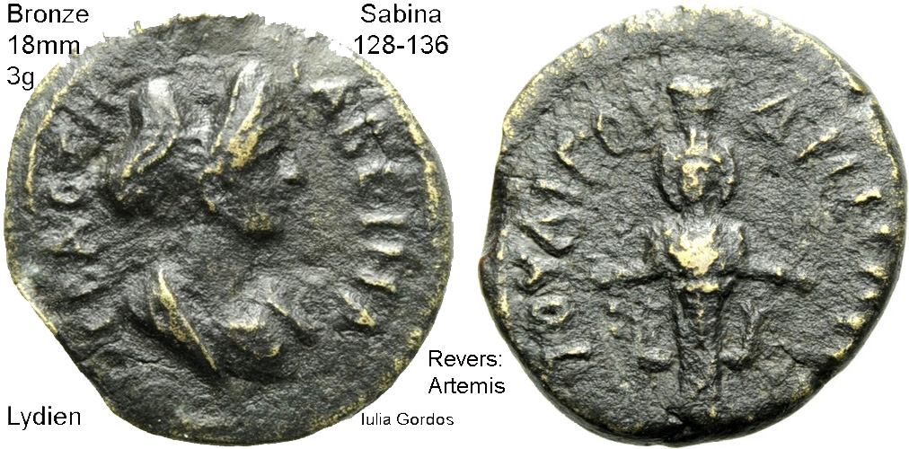 Die kleinasiatische Provinzialmünze zeigt rückseitig die ephesische Fruchtbarkeitsgöttin Artemis.