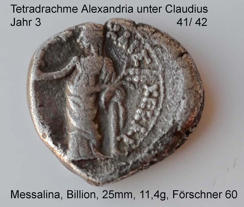 Die alexandrinische Münze zeigt die dritte Gemahlin des Kaisers Claudius, Valeria Messalina. Sie wird stehend an eine Säule gelehnt, im Arm Ähren haltend, gezeigt. Aufgrund der dezentrierten Prägung ist auf der linken Seite die Schrift verloren und die beiden Kinder auf dem rechten Arm Messalinas, Britannicus und Octavia, sind nicht zu sehen.