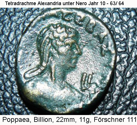Auf dem Alexandriner des Nero, Adoptivsohn des Claudius, ist im Revers seine zweite kaiserliche Gattin Poppaea Sabina im Brustbild dargestellt.