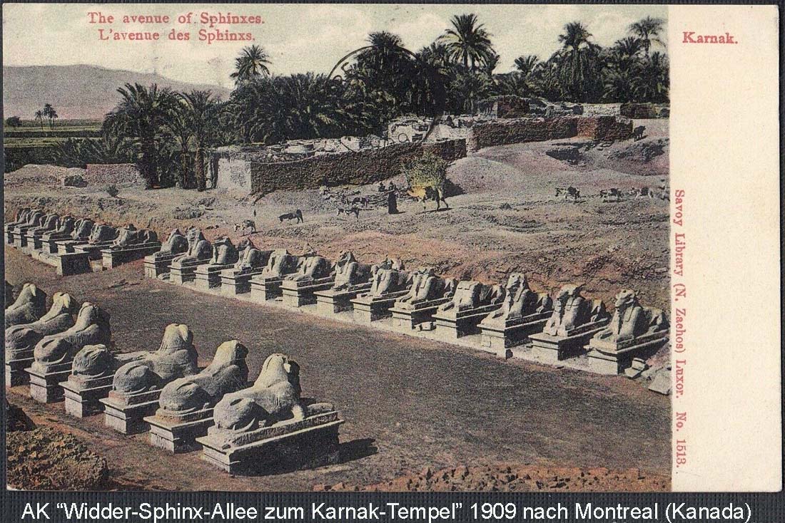 Die Widdersphinx symbolisiert den Gott Amun (in der Gestalt des Widders), der den zwischen den Vorderbeinen des Tieres dargestellten Pharao beschützt. Die Sphingen-Alleen verbanden als Prozessionswege die beiden Tempelanlagen von Luxor und Karnak.