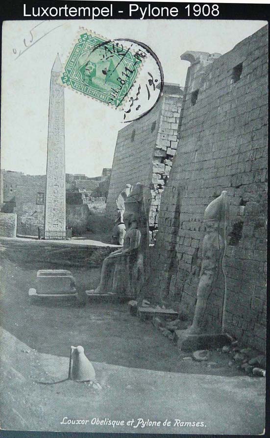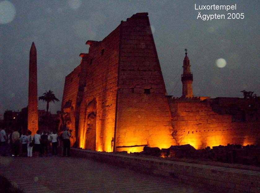 Die beiden Fotos zeigen den Eingangsbereich der Tempelanlage von Luxor. Vor dem Pylon (von 2 Türmen flankierter Tempeleingang) steht ein 25 m hoher Obelisk. Der zweite des ursprünglichen Obeliskenpaares wurde 1836 nach Paris transportiert und steht heute am Place de la Concorde. Die Bauwerke stammen aus der Zeit Ramses des Großen.