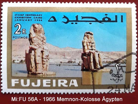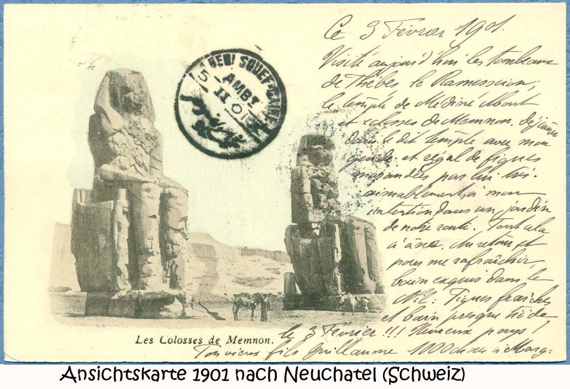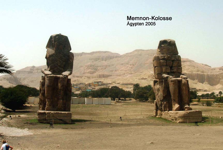 Die zwei monolithischen Kolossalstatuen sind ca. 18 m hoch und haben ein Gewicht von etwa 1300 Tonnen. Sie waren ursprünglich die Wächterfiguren am Pylon des riesigen Totentempels des Pharaos Amenophis III., der im 14. Jahrhundert v.u.Z. errichtet wurde. Amenophis III. war der Vater des berühmten Ketzerpharaos Echnaton. Infolge eines Erdbebens im Jahr 27 v.u.Z. stürzten große Teile des Tempel ein und die Kolossalstatuen wurden von den Schultern bis zum Becken gespalten. Von diesem Zeitpunkt an begannen die Statuen bei Sonnenaufgang zu ertönen, zu "reden". So entstand das "Orakel von Memnon", benannt nach einem mythischen König, dem Sohn der Morgenröte. Der Ort wurde damit zu einem Pilgerziel der Griechen und Römer, auch Kaiser Hadrian war hier. Nach der Restauration der Statuen unter Kaiser Septimius Severus verschwand das Phänomen, das Orakel schwieg.