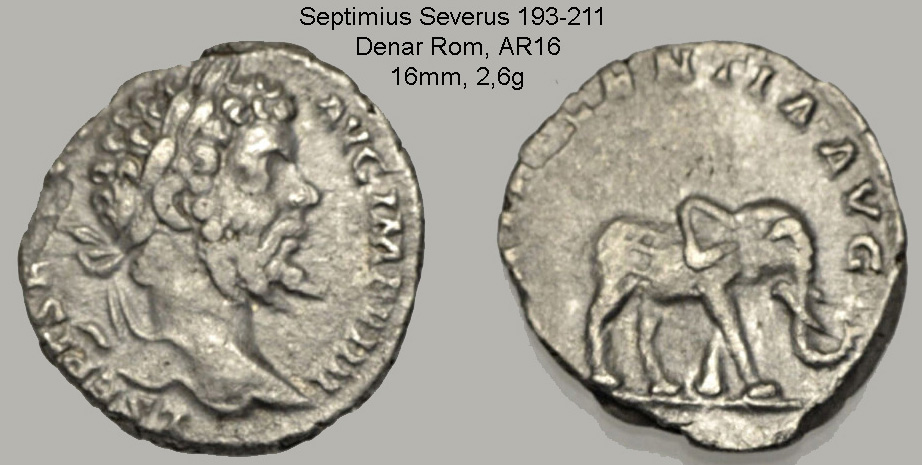 Auf dem römischen Denar ist im Revers ein Elefant geprägt. Elefanten gehörten in der Heimat des Septimius zur örtlichen Fauna. In der Antike waren Elefanten Arbeitstiere im natürlichen Lebensraum, Kriegswaffe bei den hellenistischen Griechen, Sensationsobjekte im Amphitheater und dressierte Akteure im Zirkus. Verarbeitetes Elfenbein war ein sehr hochpreisiges Luxusgut.