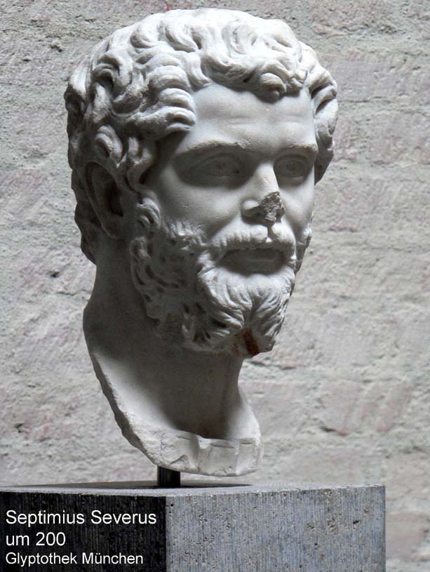 Aufgrund einer nicht geregelten Kaisernachfolge brachen nach der Ermordung des Commodus bürgerkriegsähnliche Wirren aus. Unter mehreren "Kaiseranwärtern" setzte sich Septimius Severus 193 als nordafrikanischer Provinziale mit punischen Wurzeln durch. Er begründete die neue severische Dynastie, die zweite nicht italische nach den südspanischen Antoninen.