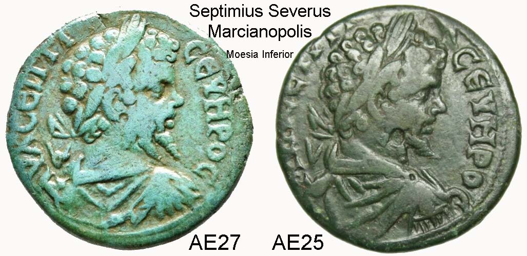 Die beiden Provinzialprägungen des Septimius Severus "AV K L CEPTI CEVHPOC" stammen aus Marcianopolis im heutigen Bulgarien, etwa 25km von Warna und zum Schwarzen Meer entfernt. Die Stadt wurde durch Trajan 106 gegründet. Sie wurde die Hauptstadt der römischen Provinz "Moesia Inferior".
