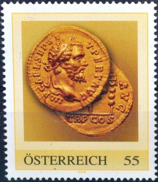 Auf der österreichischen Briefmarke ist ein Gold-Aureus des Kaisers mit Feldzeichen abgebildet.