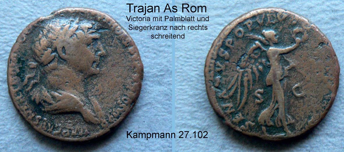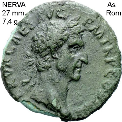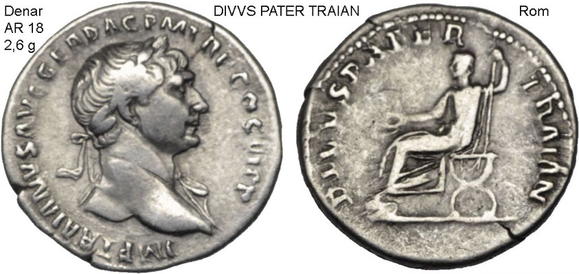 Das As des Nerva zeigt das Bildnis des kaiserlichen Adoptiv-Vaters Trajans. Auf dem "Divus-Pater-Traianus-Denar" ist auf dem Avers der neue Kaiser und im Revers der vergöttlichte leibliche Vater Trajans, der wohl vor 100 starb, mit Zepter auf dem kurulischen Stuhl abgebildet. Dieser Denar verdeutlicht die enge Verbundenheit Trajans zu seinem biologischen Vater, den Legaten von Syrien, Sieger über die Parther und Prokonsul von Asia. Trajan lernte das Soldatenhandwerk von der Pike auf. Er diente unter seinem leiblichen Vater als Militärtribun in Syrien, kämpfte am Rhein und am Euphrat und hatte sich unter den Legionären einen sehr guten Ruf erworben.