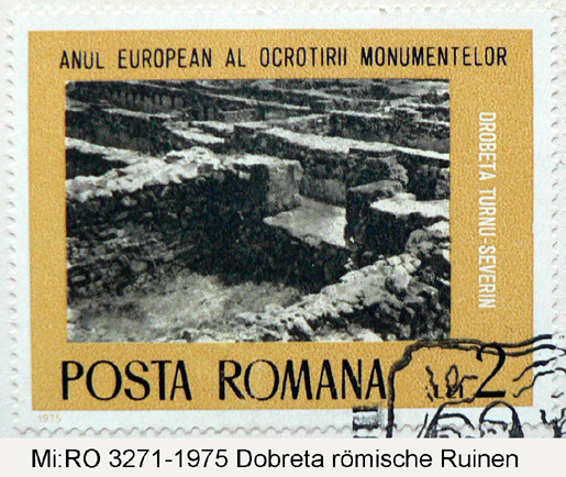 Die rumänische 2-Lei-Briefmarke aus dem Jahr 1975 bildet die ausgegrabenen römischen Ruinen von Dobreta ab.
