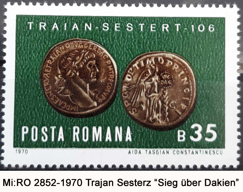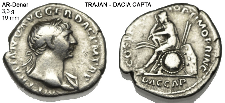 Das ehemalige dakische Königreich wurde als römische Provinz "Dacia" in das Imperium eingegliedert. Der Eroberungsdenar zeigt im Revers einen trauernden Daker, sitzend auf einem Waffenhaufen nach links, darunter DAC CAP. Nach Trajans Sieg wurde in der Dobrudscha bei Adamklissi das "Tropaeum Traiani" dem Mars Ultor geweiht. Durchmesser und Höhe des Baus betrugen 40 m. Heute ist der antike Kernbau des Siegesdenkmals aus einer Stein- und Mörtelmasse und die Basis aus sieben Treppenreihen und dem unteren Umgang an ihrem ursprünglichen Standort erhalten. Daneben steht ein Modell des Tropaeum Traiani im Maßstab 1:20. Beide sind auf der rumänischen 1,75-Lei-Briefmarke aus dem Jahr 1975 abgebildet.