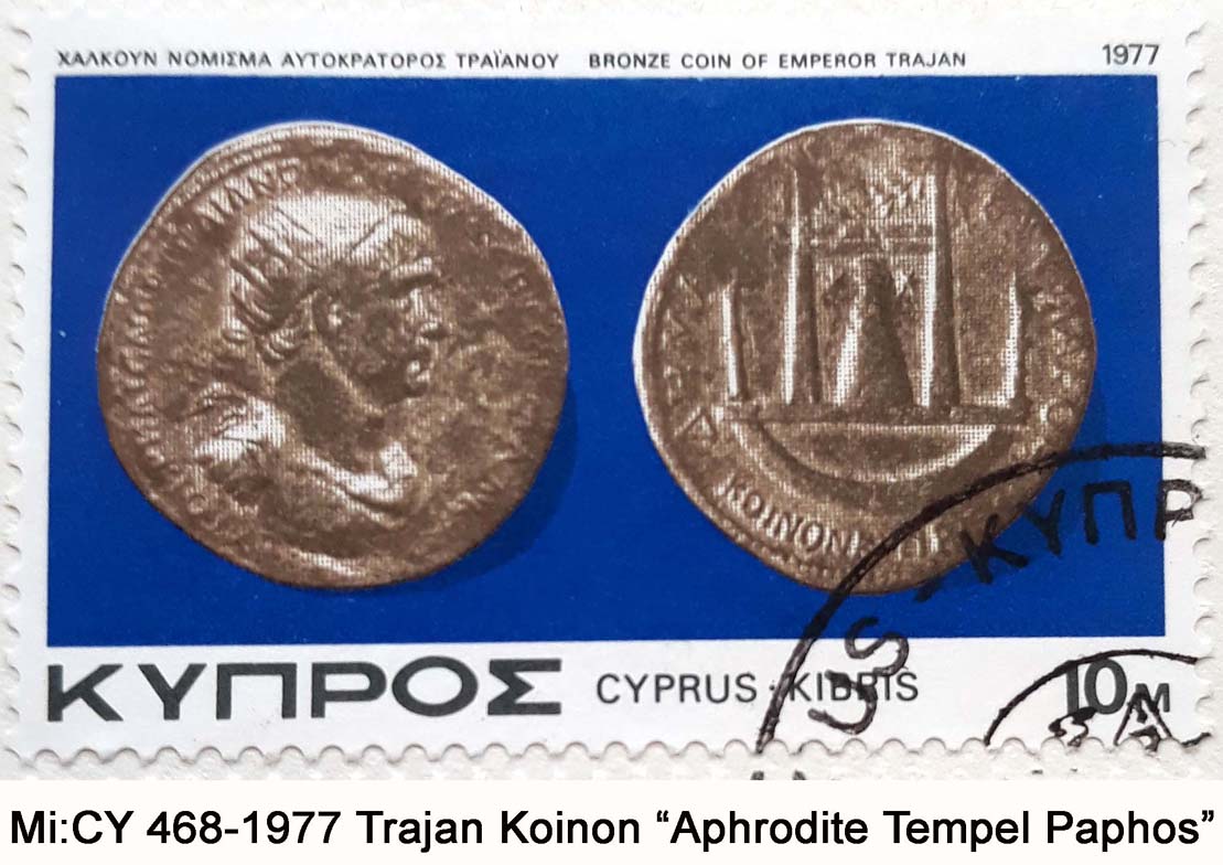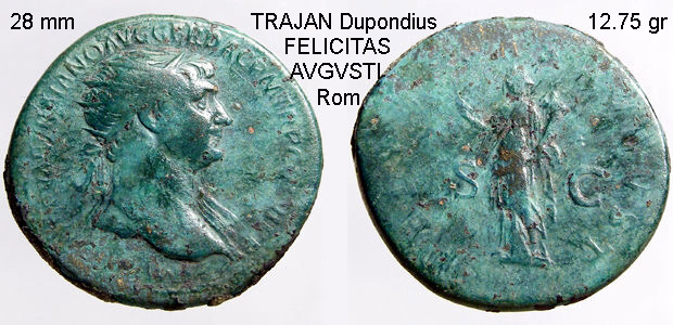 Auf dem römischen Dupondius des Trajan ist im Revers Felicitas mit Füllhorn abgebildet. Felicitas Augusti war die göttliche Macht, die den glücklichen Ausgang einer Handlung des Kaisers beeinflußte.