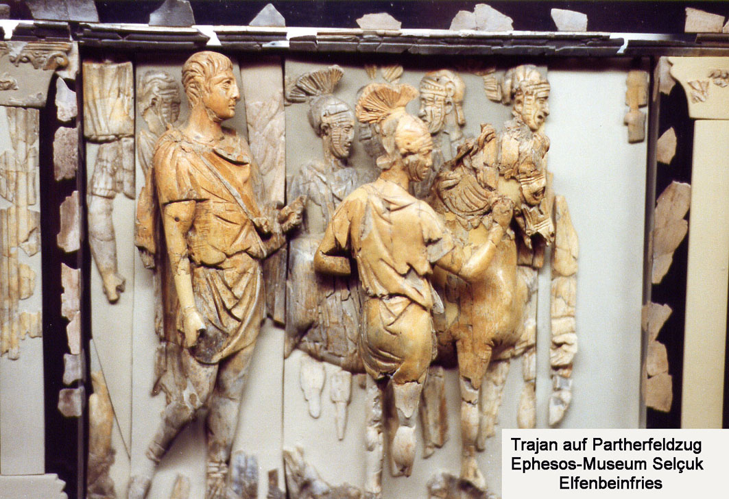 "Nach Beendigung des zweiten Dakerkrieges feierte Kaiser Trajan in Rom einen Triumph und gab dem Volk prächtige Spiele und Spenden an Getreide, Öl und Wein. Die erbeuteten Schätze waren so gewaltig, daß der Senat die Errichtung der Trajanssäule und des Trajansforums beschloß, daß mit seinem Reiterstandbild noch 250 Jahre später den römischen Kaiser Constantius II. in Erstaunen versetzte." Wolfgang Seyfarth "Römische Geschichte Kaiserzeit 1" - Akademie Verlag Berlin 1980