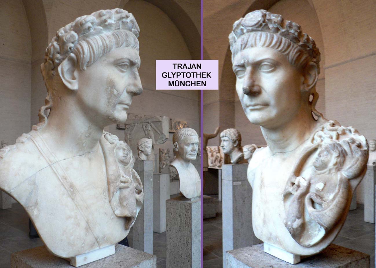 "Die herrscherbildlichen Qualitäten erfahren an dem Bildnis Trajans nicht nur eine Erneuerung, sondern auch eine sichtbare Steigerung. Unbestechlicher Ernst und Entschiedenheit im Sinne römischer 'gravitas' und 'serenitas' mischen sich mit Abstand gebietender Erhabenheit 'auctoritas' und Ruhe 'tranquillitas', Gerechtigkeit 'iustitia' und Milde 'clementia'. .... Optimus princeps (bester Princeps), dieser Titel ist Trajan 114 vom Senat zuerkannt worden." - Wolfgang Schindler "Römische Kaiser - Herrscherbild und Imperium" Koehler & Amelang Leipzig 1985