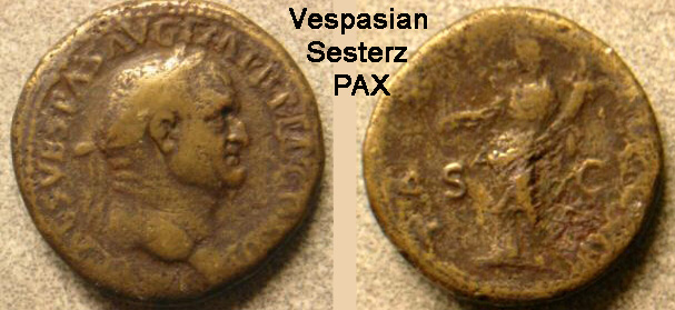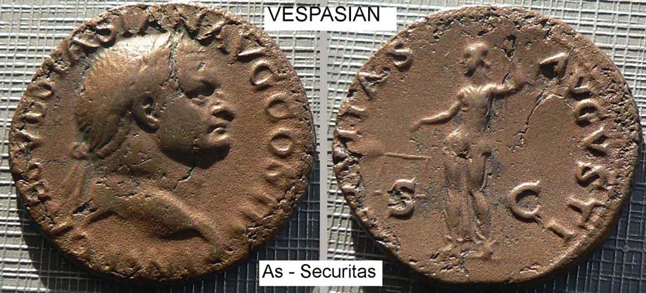 Auf dem römischen As ist im Revers Securitas abgebildet. Securitas war die göttliche Macht, die bewirkte, daß die Menschen in Sicherheit leben konnten. Sie hält linkerhand die Gerechtigkeitswaage und stützt sich rechts auf das Herrschaftszepter. Vespasian garantierte als Kaiser nach seinem Sieg Frieden (Pax) und Sicherheit (Securitas). Diese Programmatik zeigt sich auf den Münzprägungungen am Beginn seiner Herrschaft.
