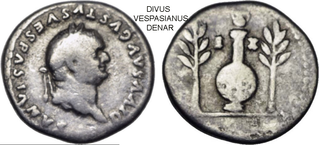 Im Jahr 79 verschied Vespasian nach zehnjähriger Herrschaft im Alter von 69 Jahren. Der fähige Restitutor hatte das Reich wieder auf ein solides Fundament gestellt, die Grenzen gesichert und die Finanzen stabilisiert. Er setzte die Erbnachfolge seiner Söhne vor dem Senat durch und sicherte damit die friedliche Entwicklung des Imperiums. Auf dem Vergöttlichungs-Denar ist rückseitig eine Urne zu sehen. Sie steht auf einer Grabstele (Cippus), an der ein Schild angelehnt ist. Die Gruppierung befindet sich zwischen zwei Lorbeerbäumchen. In der Todessymbolik stand der Lorbeer schon in der Antike für Frieden und ewiges Leben.