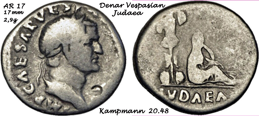 Der Siegesdenar des Kaisers Vespasian wurde anläßlich der Beendigung des Judäischen Krieges geprägt. Die Personifikation des Landes Judaea sitzt in Trauer hinter einem Tropaeum.
