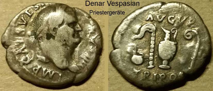 Der Denar des Vespasian zeigt auf dem Revers Opfergerätschaften (Simpulum, Aspergillum, Jug & Lituus), die von römischen Priestern bei Kulthandlungen verwendet wurden.