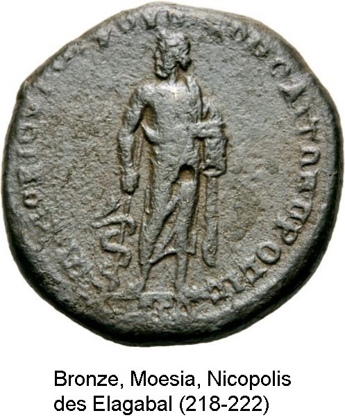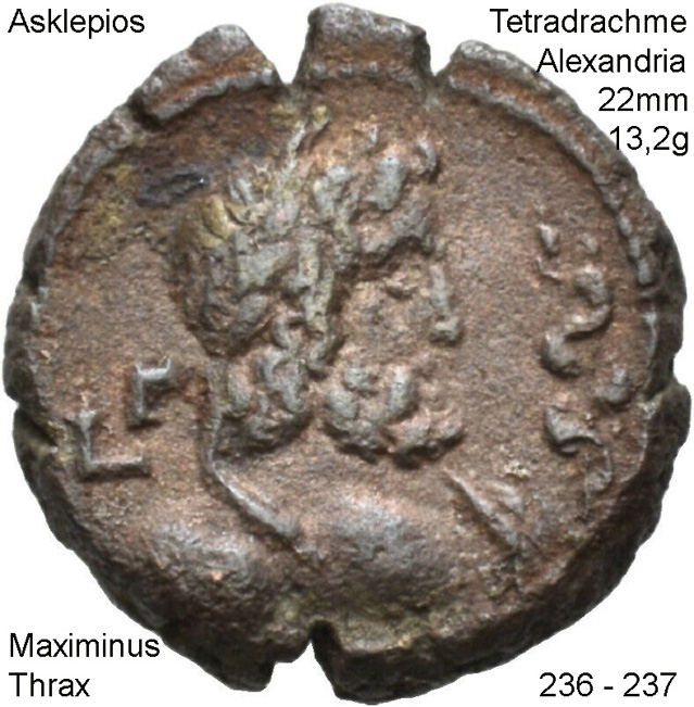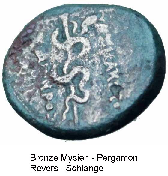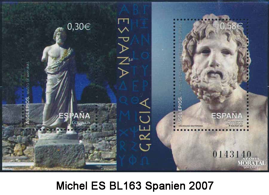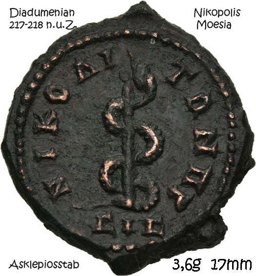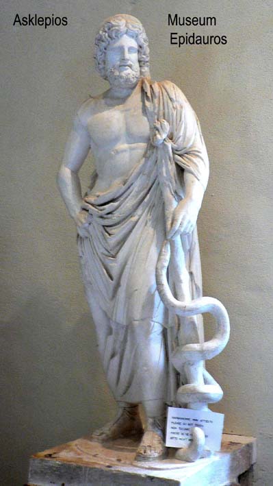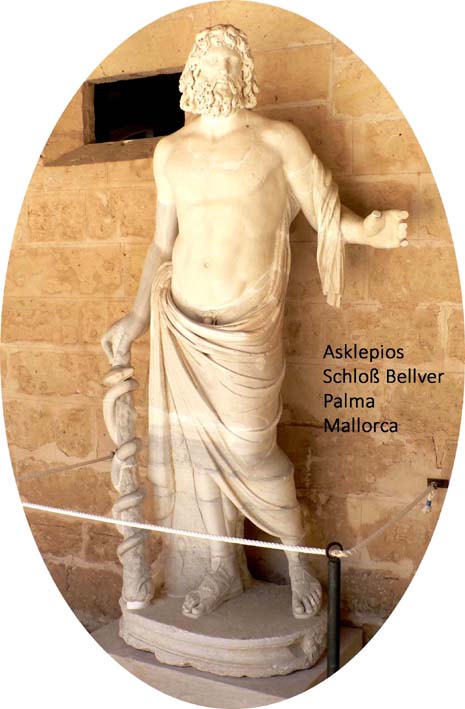 "Asklepios-Äskulap" wurde als Gott der Heilkunst verehrt. Als Sohn des Apollon und einer Sterblichen war er ursprünglich ein Heros. In der Heilkunst wurde er vom Kentauren Cheiron unterwiesen. Das Hauptattribut des Gottes ist der mit einer Schlange umwundene Stab.