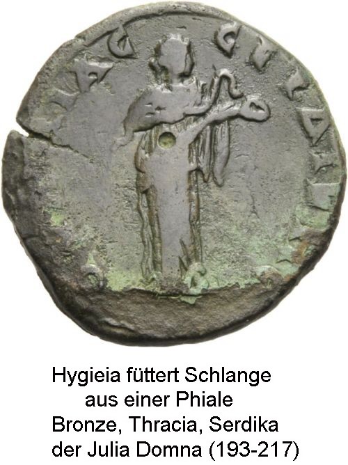 Asklepios hatte eine Tochter namens Hygieia. Sie gilt als Personifikation der Gesundheit. Von ihr leitet sich der Begriff Hygiene ab.