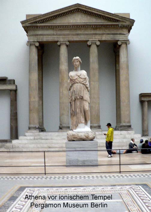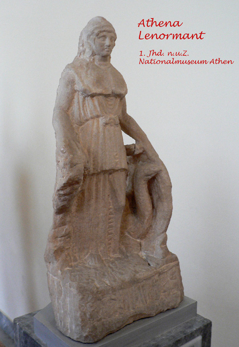 "Die Athena Lenormant wurde 1859 nahe dem Pnyx-Hügel in Athen gefunden und ein Jahr später von François Lenormant als kleine Nachbildung der Athena Parthenos des Phidias erkannt. Nach Lenormant erhielt das 41 Zentimeter hohe Stück aus pentelischem Marmor auch seinen Beinamen. Das unfertige Werk ist von herausragender kunsthistorischer Bedeutung, da es nicht nur die Statue der Athena, sondern auch die Reliefs auf dem Schild und der Basis zeigt, die bis dahin nur aus schriftlichen Quellen bekannt waren. Athena steht aufrecht in ruhiger, würdevoller Haltung, das rechte ist das Stand-, das linke das Spielbein. Sie ist mit einem attischen Peplos bekleidet. Der linke Arm ruht auf ihrem Schild. Auf dem Schild ist eine Amazonomachie zu sehen. In der rechten Hand, die auf einer Stütze gelagert ist, müsste Athena eine Nike halten, diese ist jedoch nicht erhalten. Die nicht völlig ausgearbeitete Basis zeigt die Geburt der Pandora. Auch die Rückseite ist noch in unfertigem Zustand." Quelle: Wikipedia
