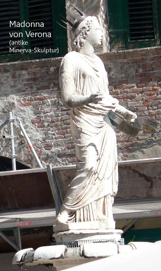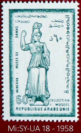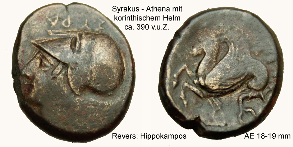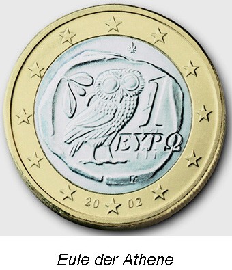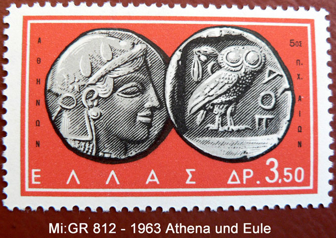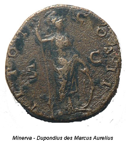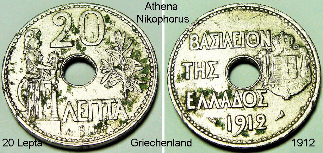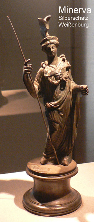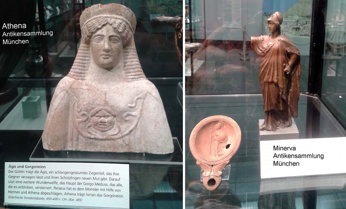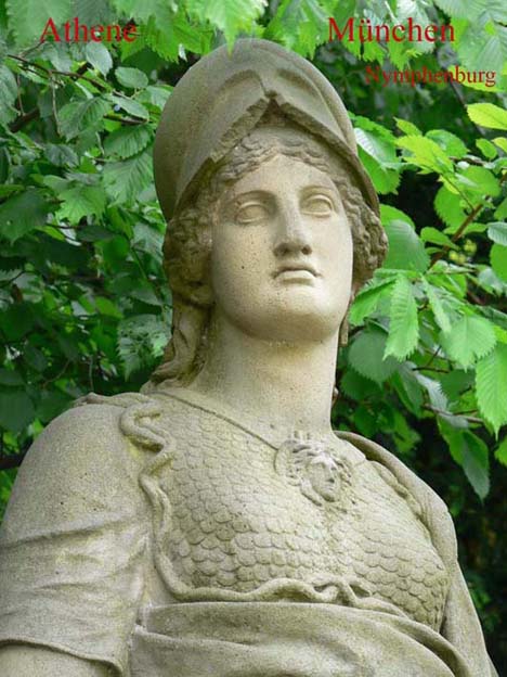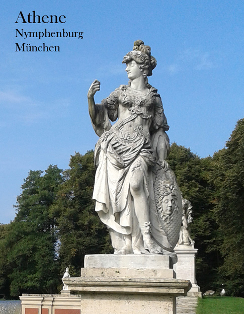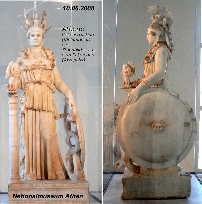 Die jungfräuliche Athene oder Athena, Tochter des Zeus, ist die Göttin der Weisheit, der strategischen Kriegsführung, der Kunst und des Handwerks. Sie entspricht diesbezüglich der römischen Göttin Minerva. Athene war zugleich die Schutzgöttin Athens, ihr römisches Pendant die Stadtgöttin Roma. Als die sieghafte "Athena Nikephoros" auf dem Thron sitzend, hält sie die Siegesgöttin, die sie bekränzt.