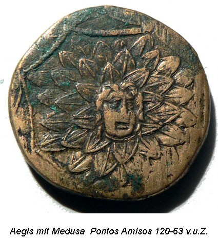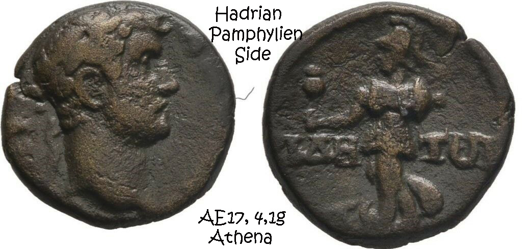 Die hadrianische Provinzmünze zeigt rückseitig die Athena von Side mit Schild und Granatapfel. Der Legende nach bedeutet Side Granatapfel und geht auf eine Fruchtbarkeitsgöttin zurück, die hier zum Granatapfelbaum erstarrte und der sich dann über die ganze Türkei verbreitete.