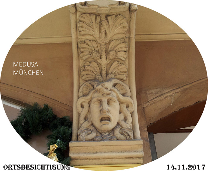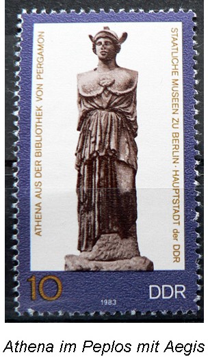 Athena, im Peplos gewandet, trägt einen Speer und und den Aegis, das Gorgoneion mit dem Haupt der Medusa.