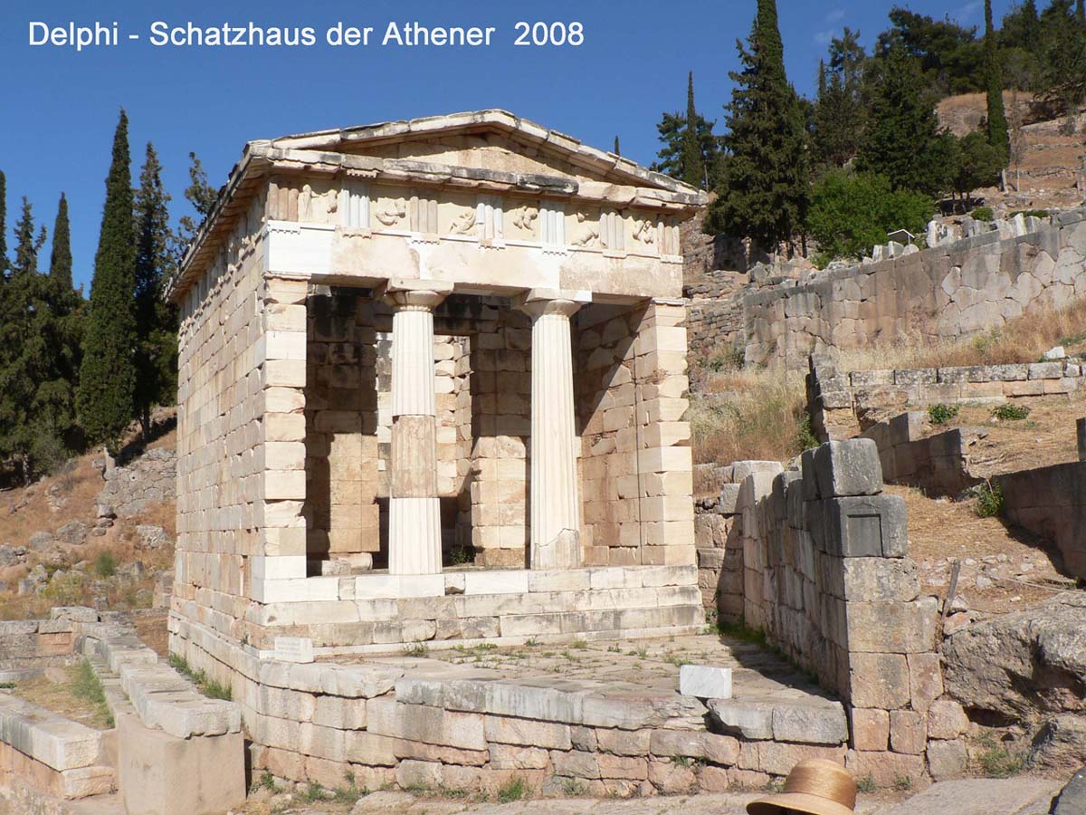 Das Schatzhaus der Athener ist eines der berühmtesten Weihgeschenke und wahrscheinlich nach der Schlacht von Marathon errichtet worden. Es ist ca. 9,7 m lang und 6,6 m breit. Die Eingangseite ist mit 2 dorischen Säulen geschmückt. Der Bau besaß zahlreiche Friese mit Reliedarstellungen, die Amazonenkämpfe, Theseus- und Heraklestaten thematisierten. Es waren persische Waffen aus der Siegesbeute der Athener Südwand des Schatzhauses aufgestellt. Ab dem 3. Jahrhundert v.u.Z. wurden Ehreninschriften für Athener Bürger an den Wänden angebracht. Aus dem 2. Jahrhundert v.u.Z. sind zwei Hymnen an Apollon mit antiken Noten für Vokal- und Instrumentalmusik auf Inschriten erhalten.