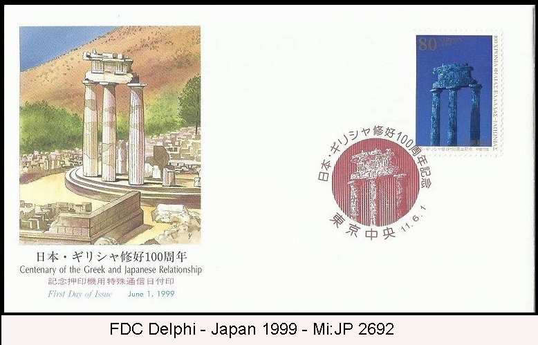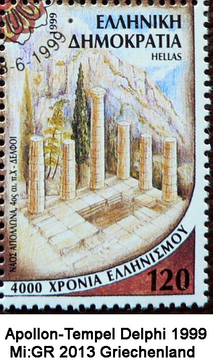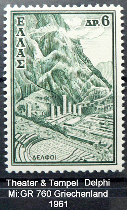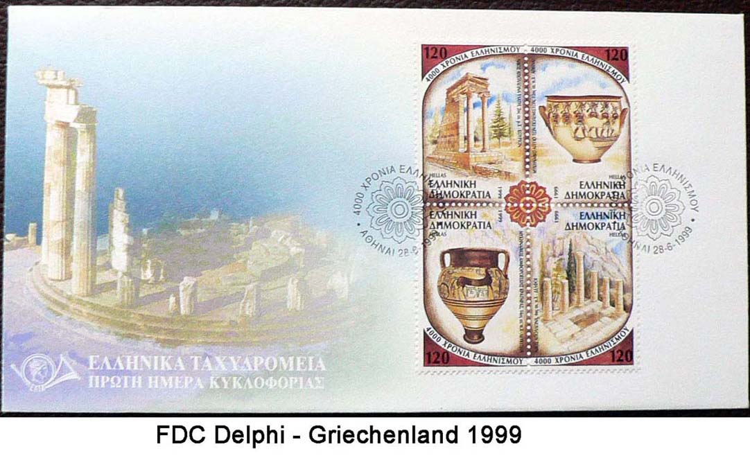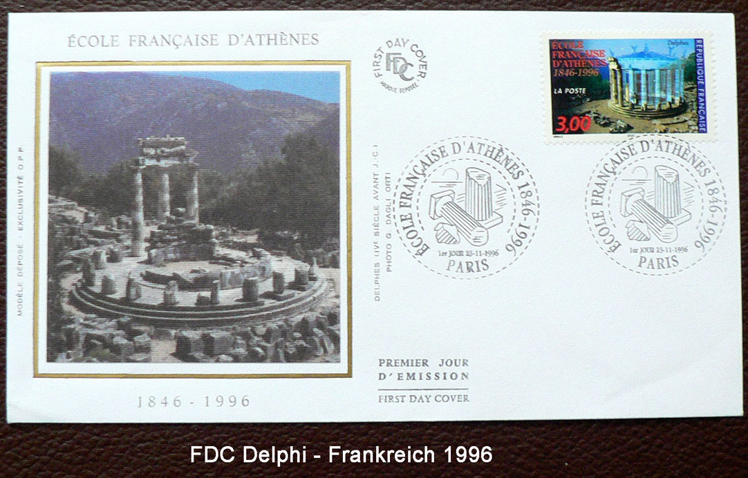 Die FDCs aus Frankreich und Griechenland zeigen die Tholos im Heiligtum der Athena Pronaia. Sie wurde um 390 v.u.Z. errichtet und besaß einen Durchmesser von 13,50 m mit 20 dorischen Säulen.