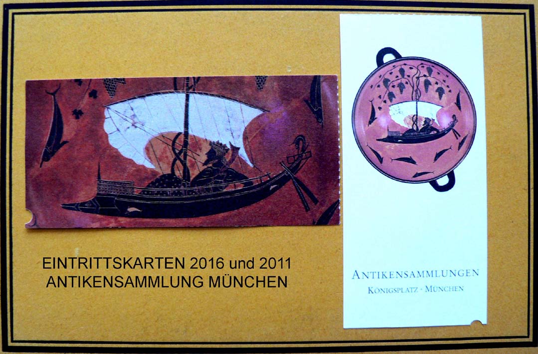 "Wenn Exekias einmal das ganze Rund mit einem wundervollen Idyll, den von Delphinen umtanzten Bringer des Weinstocks im Segelboot, verziert, so gehört dies zu den Seltenheiten; die ziegelrote Bemalung des Grunds ist vollends ein Unikum." Ernst Buschor "Griechische Vasenmalerei" R.Piper München, zweite Auflage 1914