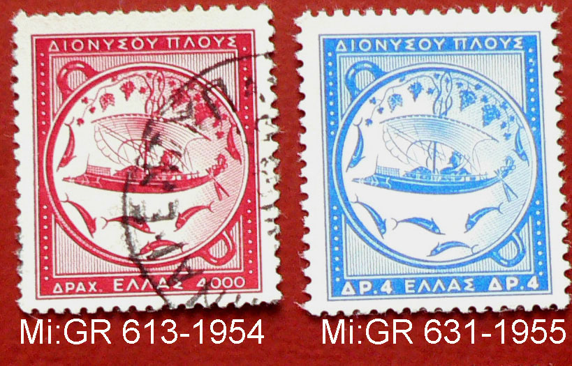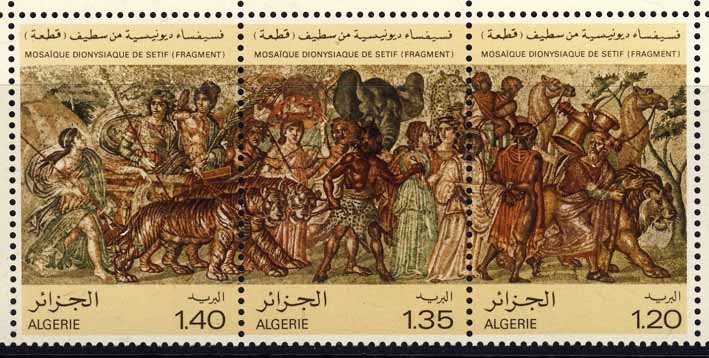 Dionysos heiratete die Sterbliche Ariadne, nachdem sie von von Theseus verlassen wurde, auf der Insel Naxos. Auf der algerischen Briefmarkenausgabe wird das Dionysos-Mosaik "Hochzeitszug mit Ariadne" in Setif Algerien gezeigt.