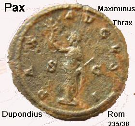 Die Tetradrachme des Numerian zeigt Eirene mit Ölzweig und Zepter. Auf dem Dupondius des ersten Soldatenkaisers ist die Göttin Pax zu sehen.