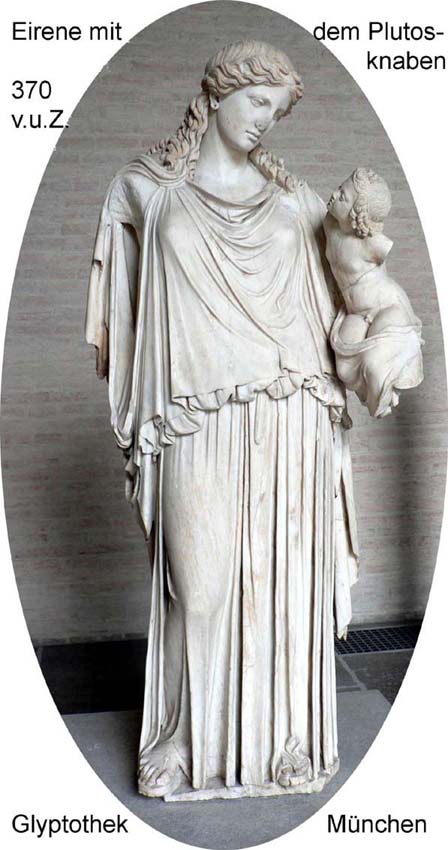 Die griechische Friedensgöttin Eirene wurde besonders in Athen nach dem Peleponnesischen Krieg 323 v.u.Z. kultisch verehrt. Berühmt ist die Skulptur der Eirene mit dem Plutosknaben auf dem Arm (Sinnbild für Reichtum in friedlichen Zeiten). Ihre römische Entsprechung Pax war die Personifikation des als göttlich verstandenen Friedens und seit dem Augusteischen Zeitalter besonders verehrt.