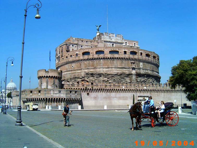 Die Engelsburg wurde ab 125 n.u.Z. im Auftrag Hadrians erbaut, der damit ein monumentales Grabdenkmal für seine sterblichen Reste und die seiner Nachfolger errichten wollte. Sie wurde 139, ein Jahr nach dem Tod des Kaisers, von seinem Nachfolger Antoninus Pius fertiggestellt und bis 217 als Grabmal für die Familie der Antoniner benutzt. Im Jahr 271 wurde das Bauwerk durch Kaiser Aurelian in die Stadtbefestigung, der soganannten "Aurelianischen Mauer" integriert. Der Rundbau hat einen Durchmesser von 64 m und ist 21 m hoch.