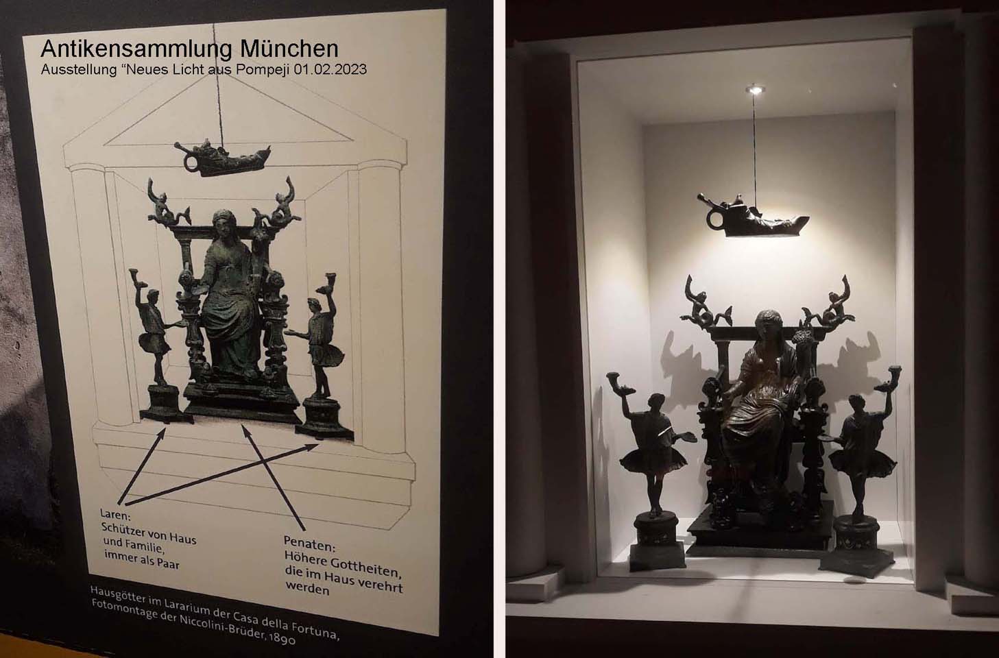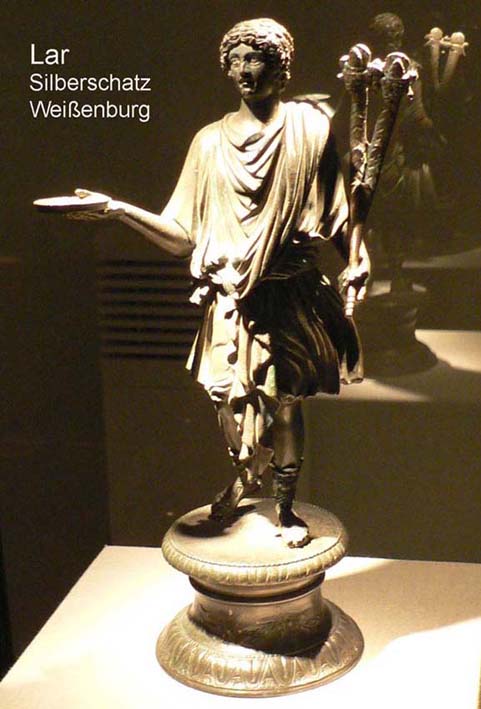 Im römischen Hauskult wurden die Laren und Penaten in Form von Statuetten, gemalten Bildern und verzierten Haushaltsgegenständen (Öllampen) als Familien- und Hausgötter verehrt. Der Anbetungsort/ Altar befand sich an einer besonderen Stelle des Hauses und auch am häuslichen Herd (Lararium). Die Schutzfunktion bezog sich auf Familienmitglieder inklusive Sklaven und das Haus selbst.