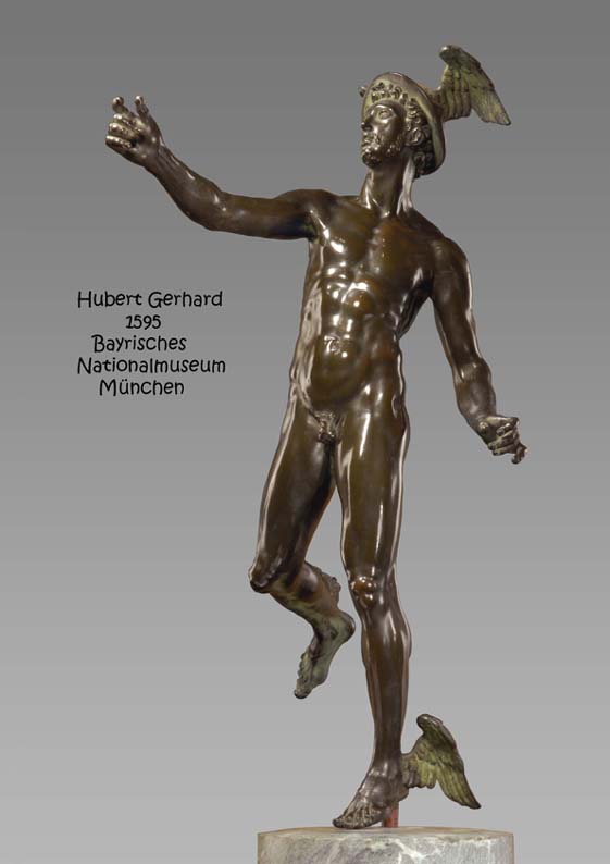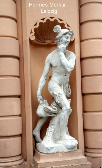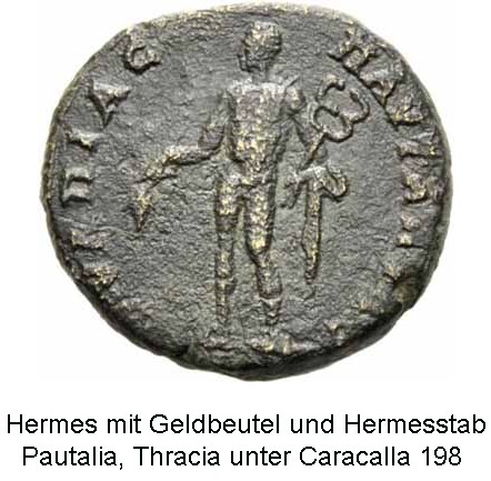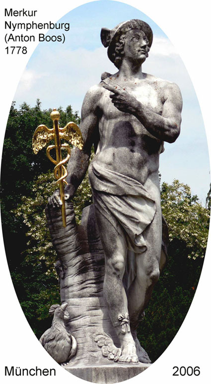 Der Götterbote "Hermes - Merkur" war der Patron der Wanderer, Reisenden, Kaufleute, Diebe, Hirten und Schelme. Als Psychopompos führte er die Seelen ins Totenreich. Attribute des Gottes sind der geflügelte Helm oder Schuhe, der Hermes-Stab (Kerykeion, Caduceus) und der Geldbeutel.