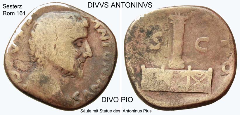 Pius mit der Umschrift DIVUS ANTONINVS auf der Vorderseite, die Säule mit der