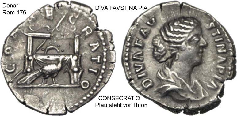 Nach der erfolgten Konsekration konnte die Reise zum Götterpantheon stattfinden. Der Kaiser fuhr entweder auf einem geflügelten Vierspänner gen Himmel oder wurde durch den Herrn des Zeitalters in Gestalt eines geflügelten Götterjungen geleitet. Der Pfau als Vogel der Juno ersetzt bei der Konsekrationsmünze der Faustina den Adler des Jupiter. Als Symbol der Apotheose tritt er hier Psychopompos (Seelenbegleiter) in Erscheinung.