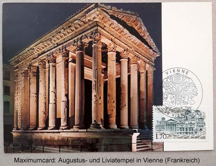 Die Stadt Vienna (Vienne) wurde um 29/ 28 v.u.Z. durch Oktavian in der römischen Provinz Gallia Narbonensis gegründet. Der Tempel des Augustus und seiner Gattin Livia diente dem Kaiserkult. Die Fassade aus einer Reihe von sechs Säulen, die das Gebälk tragen, beherrschte das Forum. Er ist der besterhaltene römische Tempel Frankreichs und bildet ein Pendant zum Kaiserkulttempel in Nemausus (Nimes).