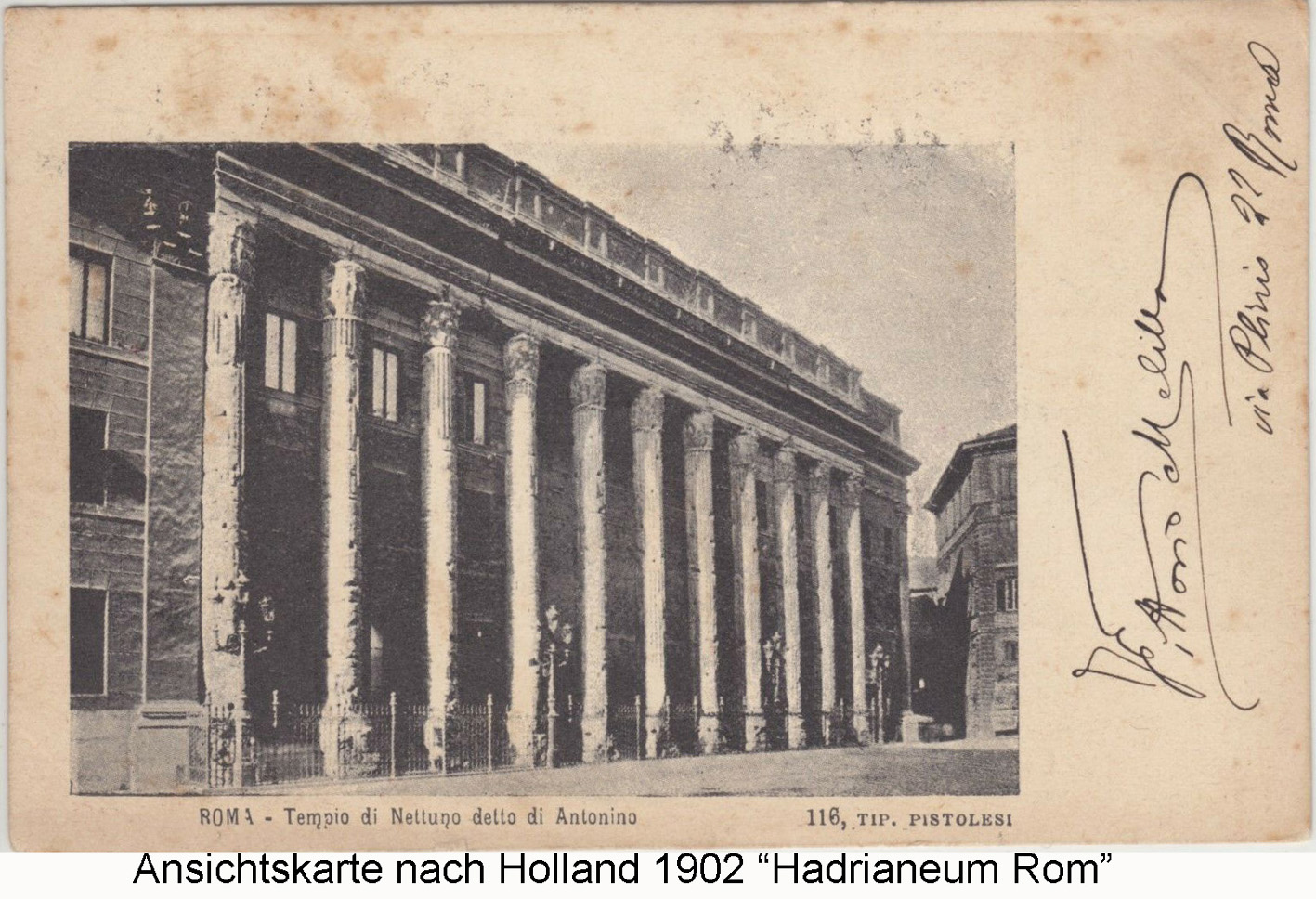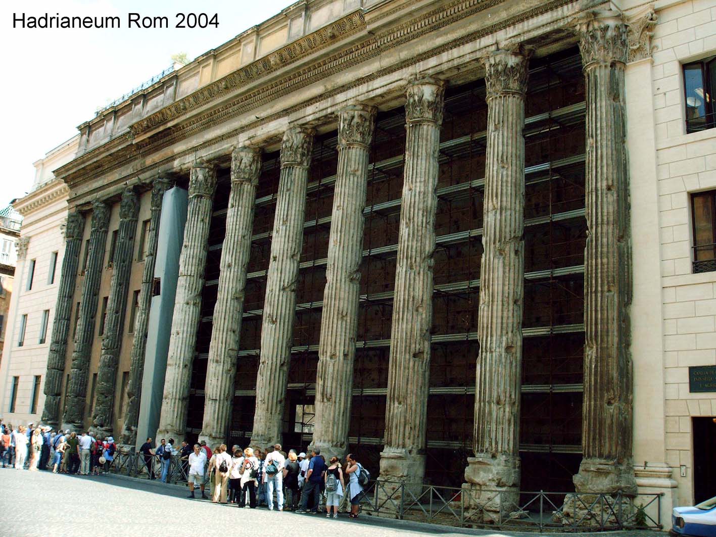 Obige Ansichtskarte und Foto zeigen die längsseitigen Tempelreste des in die moderne Börse verbauten Tempels des vergöttlichten Kaisers Hadrian. Er stand am Marsfeld und wurde durch den Kaiser Antoninius Pius im Jahr 145 eingeweiht. Früher wurde er irrtümlich als Tempel des Neptun, wie auf der alten Anschichtskarte vermerkt, angesehen.