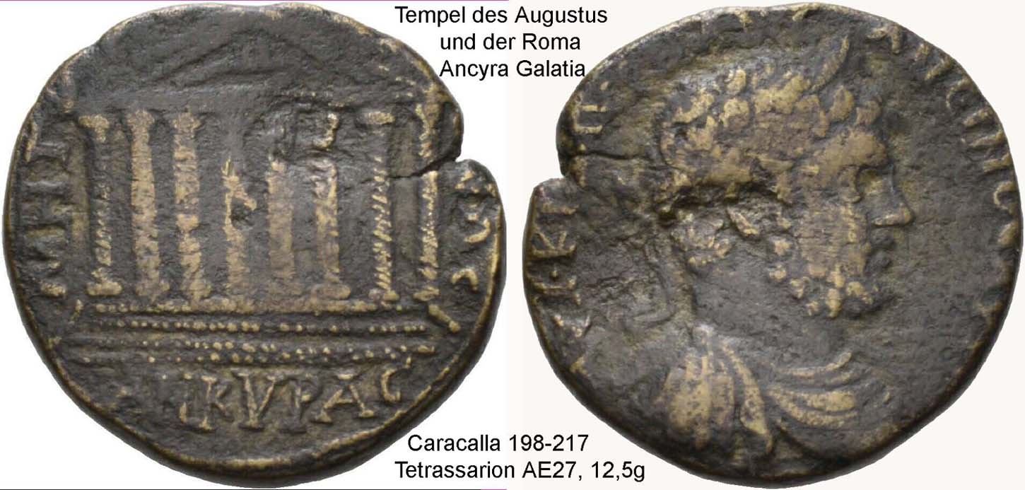 Der gut erhaltene Tempel der Roma und des Augustus in Ankara, dem antiken Ancyra in Galatien, wurde im Lauf der Geschichte in eine Moschee umgewandelt. Die Tempelmauer enthält die einzige weitgehend vollständige Inschrift der Res gestae divi Augusti, des Rechenschaftsberichtes des ersten römischen Kaisers Augustus in lateinischer und griechischer Sprache. Nach dem Standort des Tempels wird die Inschrift auch als Monumentum Ancyranum bezeichnet.
