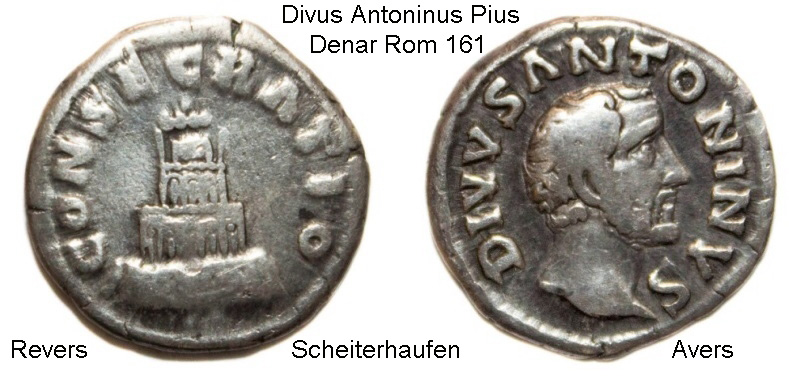 Der verstorbene Kaiser wurde auf Senatsbeschluss in den antiken Götterhimmel aufgenommen. In dem danach stattfindendem Staatsbegräbnis wurde der Leichnam dem Scheiterhaufen übergeben. Es erfolgte die Verbrennung im öffentliche Akt der Weihe (consecratio).