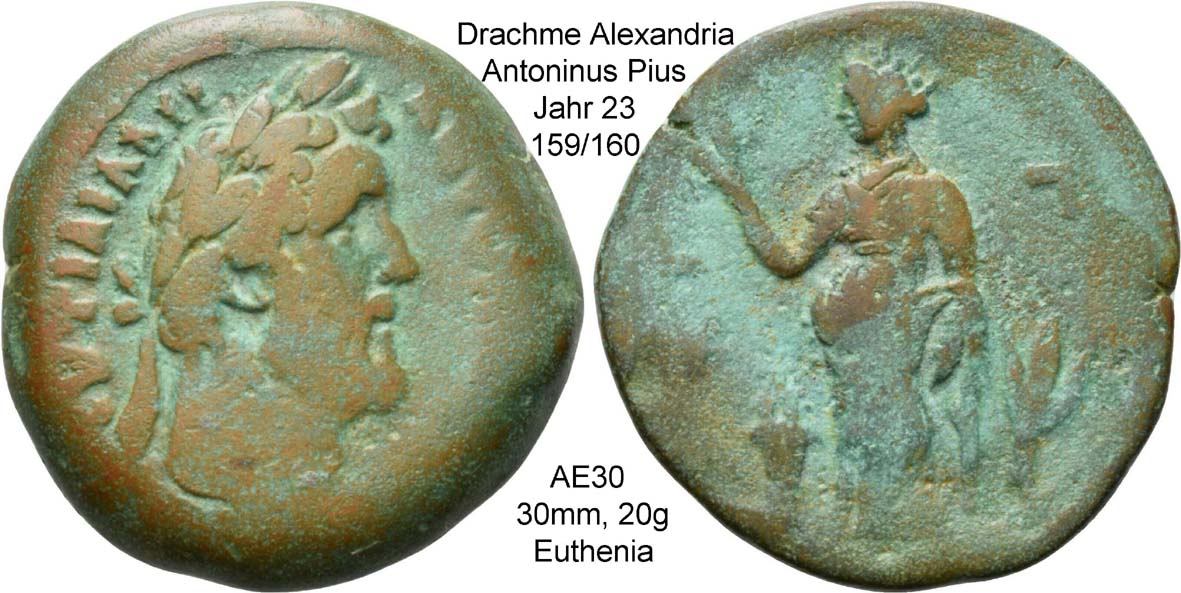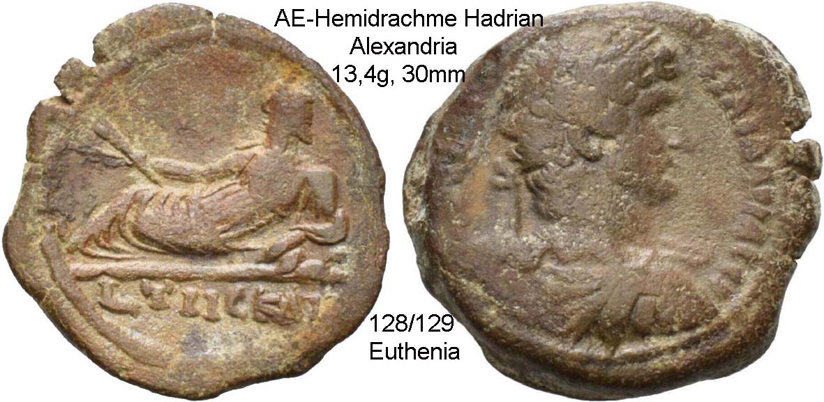Die auf der Rückseite der alexandrinischen Hemidrachme abgebildete Euthenia lagert nach links und hält Ähren und Mohn.